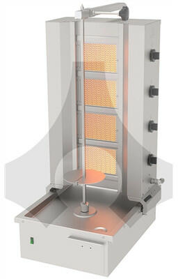 Nagy teljesítményű gyros sütő, rozsdamentes acél felépítés, alsó motorral, melynek két forgási iránya van. A gépet nyárssal és hústálcával szállítjuk.